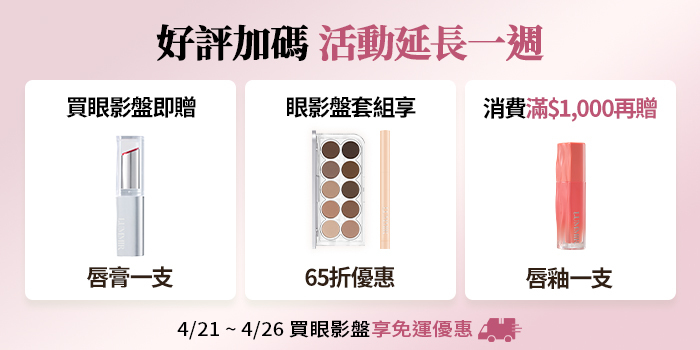 至2026-04-27T04:00:00.000+00:00截止 指定商品,【活動加碼延長一週🎉】買眼影盤贈水光唇膏1支