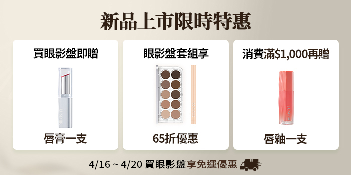 至2026-04-20T16:00:00.000+00:00截止 全店,【眼影盤上市特惠🎨】消費滿額贈玻璃唇釉一支